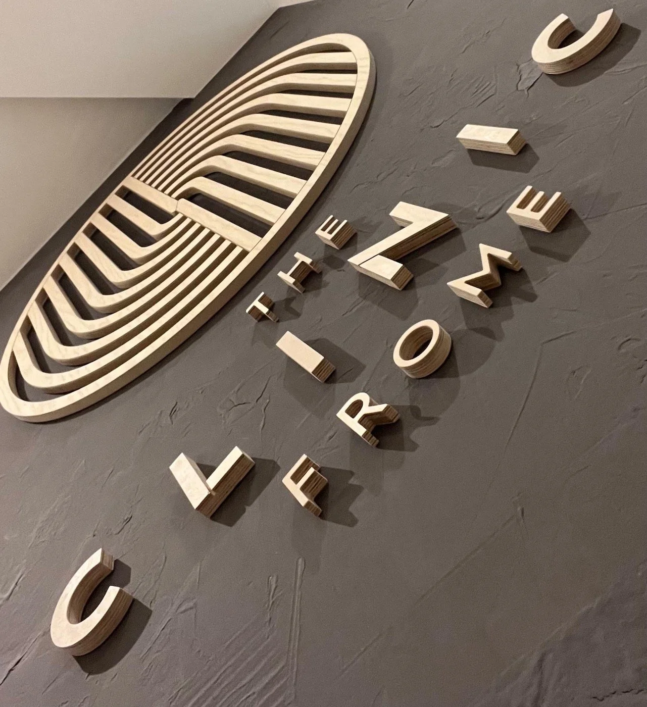 Close-up view of The Clinic Frome wooden logo with curved slats on a dark surface.
