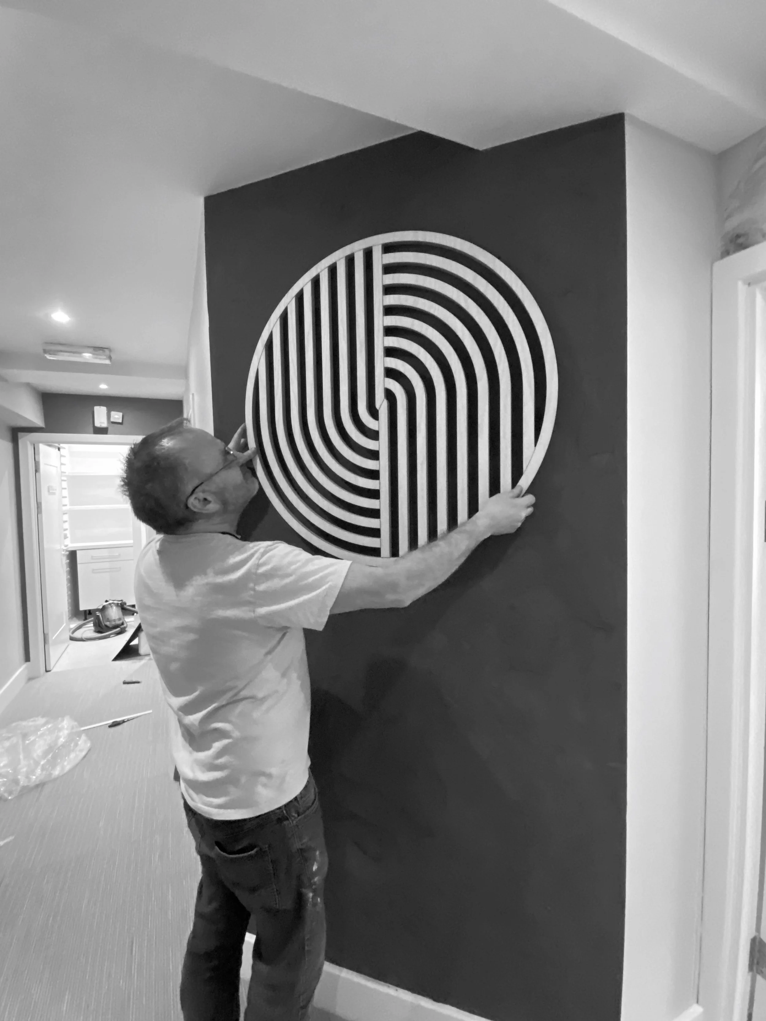 Martin John, hanging a large, circular Clinic Frome logo artwork on a dark wall in the waiting room of The Clinic Frome.